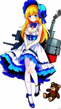 立ち絵, 立绘, characterdesign, sprite, 1girl, teddy bear, torn clothes, stuffed animal, solo, stuffed toy, blonde hair, breasts, pantyhose, rigging, blue footwear, blue eyes, long hair, dress, bonnet, torn pantyhose, damaged, blush, white background, torn dress, bow, white pantyhose, flight deck, machinery, simple background, panties, covering breasts, frills, smoke, broken, full body, blue ribbon, ribbon, high heels, shoes, blue bow, underwear, cleavage, large breasts, blue dress, cannon, hat, frilled dress, looking at viewer, turret, covering, white panties, white dress, bangs, medium breasts, blue headwear, crossed arms