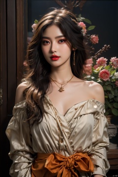 {{masterpiece}}, {best quality}}, {superfine}, {{extremely thin}, 4K, {8K}, best quality, {beauty}, a girl, solo, taking a selfie against the window, light orange and light gold style, white knitwear, advanced magazine, noble and elegant, elegant temperament, lifelike, aesthetic, floral, romantic femininity, long hair, black hair, necklace, bare shoulders, flowers, hair accessories, upper body, shoulder off, powder blusher, makeup Lips, collarbone, long sleeves, Tyndale effect, 8K, large aperture, century masterpiece
