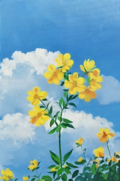 (((masterpiece))),((extremely detailed CG unity 8k wallpaper)),best quality,high resolution illustration,Amazing,highres,intricate detail,(best illumination, best shadow, an extremely delicate and beautiful),acrylic painting,sky,no humans,cloud,outdoors,scenery,flower,blue sky,day,traditional media,yellow flower,cloudy sky,painting \(medium\),plant,<lora:xxxreg-acrylic_painting:0.9>,