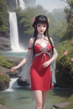 ultra realistic 8k cg,flawless,clean,masterpiece,professional artwork,famous artwork,perfect face,beautiful face,best quality,full_shot,absurdres,shenfengXiaoHuoLingEr,1girl,solo,dress,skirt,standing,blunt bangs,chinese clothes,detached collar,detached sleeves,hair bun,hair flower,halterneck,halterneck,sidelocks,torogao,smile,makeup,red lips,breasts,large breasts,jewelry,earrings,hair ornament,(outdoors:1.4),water,waterfall,butterfly,flower,long hair,realistic,looking at viewer,high heels,<lora:shenfengXiaoHuoLingEr_20240106001948-000004:0.7>,
