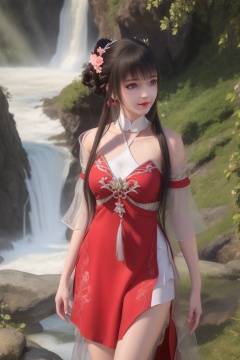 ultra realistic 8k cg,flawless,clean,masterpiece,professional artwork,famous artwork,perfect face,beautiful face,best quality,full_shot,absurdres,shenfengXiaoHuoLingEr,1girl,solo,dress,red dress,skirt,standing,blunt bangs,chinese clothes,detached collar,detached sleeves,hair bun,hair flower,halterneck,halterneck,sidelocks,torogao,smile,makeup,red lips,breasts,large breasts,jewelry,earrings,hair ornament,(outdoors:1.4),water,waterfall,butterfly,flower,long hair,realistic,looking at viewer,high heels,<lora:shenfengXiaoHuoLingEr_20240106001948-000004:0.7>,