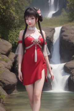 ultra realistic 8k cg,flawless,clean,masterpiece,professional artwork,famous artwork,perfect face,beautiful face,best quality,full_shot,absurdres,shenfengXiaoHuoLingEr,1girl,solo,dress,red dress,skirt,standing,blunt bangs,chinese clothes,detached collar,detached sleeves,hair bun,hair flower,halterneck,halterneck,sidelocks,torogao,smile,makeup,red lips,breasts,large breasts,jewelry,earrings,hair ornament,(outdoors:1.4),water,waterfall,butterfly,flower,long hair,realistic,looking at viewer,red footwear,<lora:shenfengXiaoHuoLingEr_20240106001948-000004:0.7>,