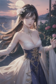 (((masterpiece))),((extremely detailed CG unity 8k wallpaper)),best quality,high resolution illustration,Amazing,highres,intricate detail,(best illumination, best shadow, an extremely delicate and beautiful),acrylic painting,1girl,flower,cloud,crescent moon,sky,moon,scenery,pink flower,outdoors,leaf,plant,blue sky,day,cloudy sky,night sky,