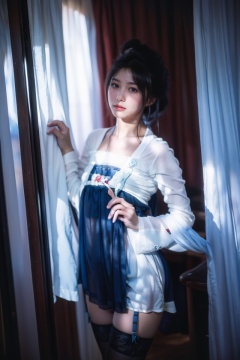 masterpiece,best quality,ultra high res,<lora:aw13xin_lora:1>,chinese clothes,hanfu,.,<lora:13lanhanfu:1>,masterpiece,best quality,ultra high res,a sensual woman with ample bosom dressed in black stockings and a seductive negligee,intricate lace details on the lingerie,smooth silk texture of the stockings,dimly lit boudoir with plush bedding,vintage furniture,crimson drapes adding depth and mystery to the background,soft moonlight filtering through sheer curtains,evoking a sense of intimate allure and forbidden temptation,captured in a tasteful yet provocative composition with a chiaroscuro play of light emphasizing curves and shadows,as if shot by a renowned fashion photographer using a medium format camera with a shallow depth of field.,