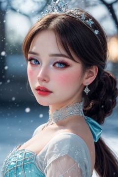 masterpiece,best quality,realistic,highres,Highly detailed,blurry background,1girl,((portrait)),close-up,braided ponytail,crystal earrings,((crown)),crystal crown,blue dress,corset,blue_bow,collar,bangs,<lora:add_more_details:0.5>,elsa \(frozen\) \(cosplay\),icetiina,frozen \(disney\),winter,snow,snowing,<lora:雪地精灵1.0_v2:0.7>,