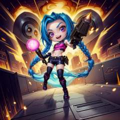 HEZI,Teamfight Tactics,little heroes,jinx \(league of legends\),1girl,rocket launcher,weapon,solo,long hair,explosion,holding,braid,chibi,twin braids,holding weapon,teeth,gloves,fingerless gloves,blue hair,bangs,smile,tattoo,pink eyes,open mouth,smoke,pink pants,:d,arm tattoo,fang,upper teeth only,belt,explosive,bare shoulders,yordle,boots,very long hair,gun,crop top,shoulder tattoo,shiny,black footwear,asymmetrical bangs,blurry,pants,full body,shoes,shiny hair,shorts,holding gun,twintails,blurry background,artist name,navel,bullet,black gloves,brown belt,flat chest,thighhighs,<lora:小小英雄-000010:0.65>,