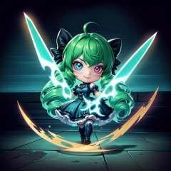 HEZI, Teamfight Tactics, little heroes, long hair, 1girl, holding, dress, smile, ahoge, bangs, bow, twintails, twin drills, hair bow, drill hair, puffy sleeves, puffy short sleeves, short sleeves, shiny hair, black dress, shiny, black bow, gloves, oversized object, scissors, green eyes, green hair, black gloves, grey dress, holding scissors, solo, solo focus, chibi, closed mouth, black sleeves, pantyhose, detached sleeves, blue hair, full body, frills, star-shaped pupils, black footwear, weapon, thighhighs, fog, heterochromia, glowing, standing, walking, frilled dress, blue eyes, outdoors, holding weapon, blush, shoes, striped, star \(symbol\)<lora:小小英雄-000010:0.65>,
