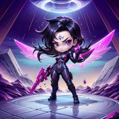 HEZI,Teamfight Tactics,little heroes,1girl,solo,bodysuit,long hair,facial mark,chibi,purple eyes,full body,looking at viewer,breasts,purple hair,black hair,standing,blue bodysuit,hand up,weapon,bangs,makeup,pink eyes,official alternate costume,closed mouth,medium breasts,outdoors,v-shaped eyebrows,multicolored bodysuit,multicolored clothes,parted bangs,rock,armor,shiny,serious,shiny hair,gloves,skin tight,small breasts,covered navel,wings,artist name,holding,alternate costume,multicolored hair,gun,dark skin,black bodysuit,floating hair,clenched hand,<lora:小小英雄-000010:0.65>,