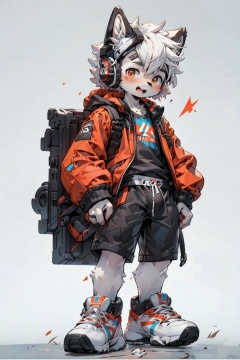 masterpiece,best quality,8K,1boy, male focus, solo, shorts, headphones, jacket, chibi, bag, shoes, brown eyes, white hair, full body, black shorts, bandaid, male child, looking at viewer, backpack, hood, standing, child, shirt, sneakers, short hair, black jacket, white shirt, grey background, closed mouth, open clothes, open jacket,red color, NJIP, furry, shota