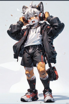 masterpiece,best quality,8K,1boy, male focus, solo, shorts, headphones, jacket, chibi, bag, shoes, brown eyes, white hair, full body, black shorts, bandaid, male child, looking at viewer, backpack, hood, standing, child, shirt, sneakers, short hair, black jacket, white shirt, grey background, closed mouth, open clothes, open jacket,red color, NJIP, furry, shota