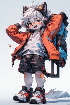 masterpiece,best quality,8K,1boy, male focus, solo, shorts, headphones, jacket, chibi, bag, shoes, brown eyes, white hair, full body, black shorts, bandaid, male child, looking at viewer, backpack, hood, standing, child, shirt, sneakers, short hair, black jacket, white shirt, grey background, closed mouth, open clothes, open jacket,red color, NJIP, furry, shota
