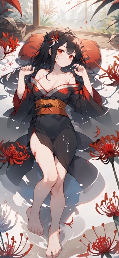Masterpiece, illustration, 8K wallpaper, super detailed, portrait,(full body),,(1 girl:1.3),solo,//( long black hair:1.3)//,(Medium breasts), ((Perfect body)),//(Beautiful detailed red eyes: 1.3)//,(Wet body:1.15),,//((open kimono)),clavicle,off-shoulder//,(((Lying on liquid))),stretch out one's hand,,//(the nether world),(dark:1.5),(in_the_river:1.2),on (blood:1.1),(red_river),((underworld)),(equinox flowers),(fog),blood_splatter, blood_river,(red_flower:1.2),(blood_wavy:1.3), (spider_lily:1.3),(ghosts,blue_fire:1),(ripples:1),(paddle:1),((surrounded by beautiful detailed spider_lily:1.3)),shiny//,,,, , , , ,