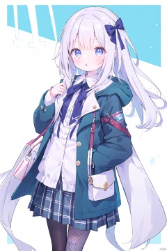 COMIC,  1girl,  bag,  bangs,  fishnet_legwear,  pantyhose,  plaid,  plaid_skirt,  pleated_skirt,  skirt,  solo,  unmoving_pattern,  long_hair,  looking_at_viewer,  shirt,  hair_ornament,  long_sleeves,  bow,  standing,  jacket,  hair_bow,  parted_lips,  open_clothes,  blunt_bangs,  medium_hair,  :o,  coat,  sleeves_past_wrists,  border,  open_coat,<lora:EMS-258722-EMS:0.500000>