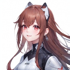 xiaojuzi, 1girl, solo, red eyes, long hair, brown hair, bangs, smile, standing, silver bodysuit, (focus on face, close-up:1.3),