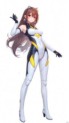 arched back, armpits, ass, blush, bodysuit, breasts, brown hair, clothes writing, eyebrows visible through hair, gloves, hair between eyes, looking at viewer, looking back, pilot suit, plugsuit, skin tight, standing, very long hair, silver bodysuit,