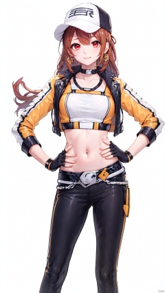 xiaojuzi, 1girl, solo, red eyes, long hair, brown hair, smile, baseball cap, belt, black gloves, black pants, medium breasts, choker, fingerless gloves, gloves, hand on hip, hands on hips, hat, jacket, leather, looking at viewer, midriff, navel, pants,