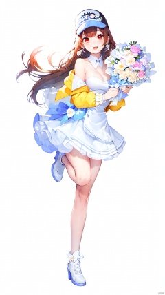 xiaojuzi, 1girl, solo, red eyes, long hair, brown hair, bangs, smile, bare shoulders, bouquet, brown hair, dress, earrings, flower, hat, high heels, holding, holding bouquet, jacket, jewelry, leg up, off shoulder, open mouth, pink flower, red eyes, rose, shoes, visor cap, white dress, white flower, white footwear, white headwear, white jacket, white rose, yellow flower, standing, standing on one leg, full body,looking at viewer,