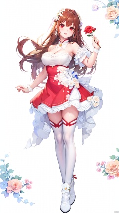 xiaojuzi, 1girl, solo, red eyes, long hair, brown hair, bangs, smile,bare shoulders, beads, cleavage, dress, earrings, flower, frills, hair flower, hair ornament, holding, jewelry, lips, long hair, , medium breasts, parted lips, pink rose, red dress, red lips, red rose, sleeveless, sleeveless dress, thighhighs, white dress, white flower, white legwear, white rose, wrist cuffs, zettai ryouiki,cowboy shot, standing, looking at viewer,