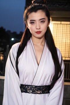 マスターチーフ PHOTOREALISTIC REALISTIC,masterpiece,best quality,highres,ultra detailed,8k,upper body,1woman,white hanfu dress,(classical long hair),hair ornament,hair bun,looking at viewer,makeup,chinese building,night,dark background,<lora:wangzuxiannsfw80:0.6>
