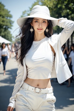 navel, jewelry, long hair, pants, looking at viewer, earrings, midriff, smile, 1girl, blurry, white pants, blurry background, arm behind head, blue eyes, crop top, cowboy shot, belt, solo focus, blush, arm up, long sleeves, white hair, shirt, bangs, closed mouth, breasts, depth of field, white jacket, jacket, solo, stomach, standing, white shirt, mtianmei