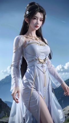 masterpiece,best quality,1girl, long hair, dress, black hair, jewelry, white dress, solo, facial mark, hair ornament, necklace, hair bun, forehead mark, earrings, cowboy shot, dynamic pose, dynamic angle,