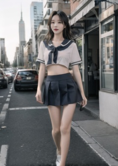 1girl, minisailor,walking on street,outdoors,city,street,bare belly,full body, <lora:minisailor:0.8>