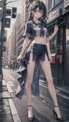 1girl, full body, (long legs), earrings,high heels,,city,street,(flower rain), hair stick,vivid,colorful, bare belly,minisailor,moyou, depth of field, 1 girl