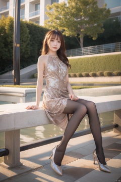 1girl, solo, dress, sitting ,pantyhose, long hair, outdoors,looking at viewer, lxx