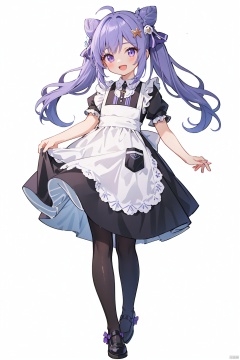 qb, 1girl, hair bun, aged down, looking at viewer, pantyhose,  purple eyes, solo, long hair, hair ornament, double bun, purple hair, sidelocks, maid, bangs, twintails, smile, simple background, alternate costume, full body, :d, black pantyhose, short sleeves