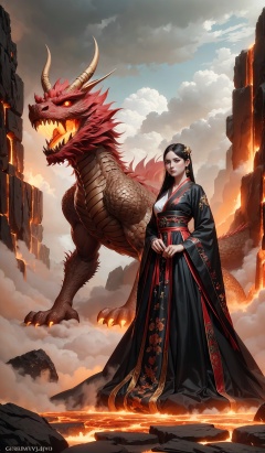 A young girl stands in front of a huge dragon, her eyes firm and fearless. Around her are bubbling lava, glowing brightly. The girl wears a simple dress and her hair is messy due to the wind. She holds a sword tightly in her hand, ready to face the upcoming challenge. High quality photo, intricate details, dramatic lighting, intense atmosphere, epic fantasy art by Gregory Manchess, Alphonse Mucha, Trending on DeviantArt, Trending on ArtStation, Intricate, High Detail, Sharp focus, dramatic, photorealistic painting art by midjourney and greg rutkowski.