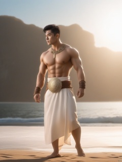 (asian), 1 Man, Roman dress, Muscular development, Outdoor, Sea, Magic wheel, Whole body, Stand, Barefoot, Bracelet, Foot ring, Breeze, There is plenty of sunshine, Light and shadow, textured skin, super detail, best quality, (looking at viewer), (handsome)