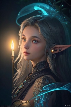(masterpiece), (extremely intricate), fantasy, (((realistic depiction of a mystical dark elf, female, enchanting, ethereal face, pointed ears, flowing hair, Bioluminescent Elements, Fairy Lights, Magical Glow))), (((darkish magical setting, mystical ambiance))), (perfect composition:1.4), aspect ratio 3:4, detailed portrayal of a beautiful mystical dark elf in a standing pose, (deviantart hd, artstation hd), (award-winning concept art), (margins, detailed face and body), professional oil painting by renowned artists, (trending on ArtStation, trending on CGSociety), intricate, high detail, sharp focus, dramatic, award-winning matte drawing cinematic lighting,