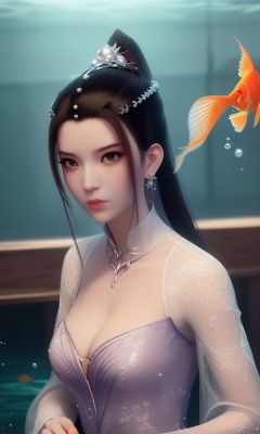 (,1girl, ,best quality, ),looking at viewer, <lora:431-DA-逆天邪神-楚月婵:0.8> ,, ,masterpiece, ((((, solo,  goldfish, ,solo focus, ,underwater, )))) ,ultra realistic 8k cg,   clean, masterpiece,     cinematic lighting, cinematic bloom,  (( , )),, , unreal, science fiction, luxury, jewelry, diamond, gold, pearl, gem, sapphire, ruby, emerald, intricate detail, delicate pattern, charming, alluring, seductive, erotic, enchanting, hair ornament, necklace, earrings, bracelet, armlet,,(cleavage),