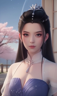(,1girl, ,best quality, ),looking at viewer, <lora:431-DA-逆天邪神-楚月婵:0.8> ,, ,masterpiece,(( , )),, realistic,science fiction,mole,,ultra realistic 8k cg,     ,cherry blossoms,,night, night sky, crescent moon, moonlight,,(facing viewer, looking at viewer, , ),  (cleavage), (),
