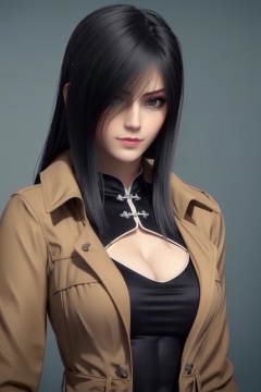 ((HRD, HUD, 8K)),((masterpiece, best quality)), highly detailed,1girl, solo, black hair, long hair, lips,breasts, large breasts, cleavage,coat, dress, chinese clothes, cleavage cutout, clothing cutout,simple background, grey background, upper body, standing, looking at viewer,<lora:超神学院黑甲凉冰_2.0:0.73>