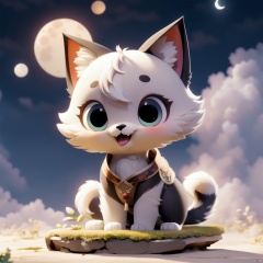maomi,cat,banhua,doodle,1girl,chibi,cute, Chang 'e, white hair, hanfu, cloud, (moon:1.2), waves, mythic monochrome,Mid-Autumn Festival, solo, the upper body,Chinese clothes,
