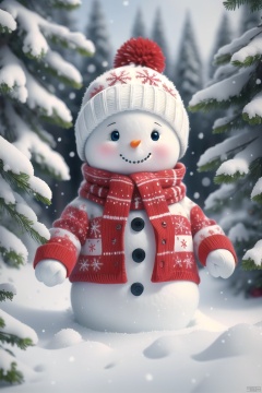 snowman, snow, no humans, hat, snowflakes, scarf, winter, snowing, blush, solo, smile, outdoors, winter clothes, tree