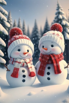 2 snowman, snow, no humans, hat, snowflakes, scarf, winter, snowing, blush, solo, smile, outdoors, winter clothes, tree