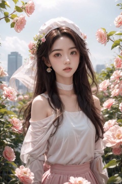 A girl,silk,cocoon,spider web,Solo,Complex Details,Color Differences,Realistic,(Moderate Breath),Off Shoulder,Eightfold Goddess,Pink Long Hair,White Headwear,Hair Above One Eye,Green Eyes,Earrings,Sharp Eyes,Perfect Fit,Choker,Dim Lights,cocoon,transparent,jiBeauty,1girl,flowers,mtianmei,Look at the camera.,flowing skirts,Giant flowers,,