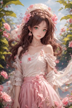 A girl,silk,cocoon,spider web,Solo,Complex Details,Color Differences,Realistic,(Moderate Breath),Off Shoulder,Eightfold Goddess,Pink Long Hair,White Headwear,Hair Above One Eye,Green Eyes,Earrings,Sharp Eyes,Perfect Fit,Choker,Dim Lights,cocoon,transparent,jiBeauty,1girl,flowers,mtianmei,Look at the camera.,flowing skirts,Giant flowers,, pld
