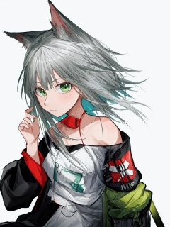 1girl, solo, kal'tsit \(arknights\), green eyes,short hair, silver hair, animal ear fluff, animal ears, bangs, closed mouth, looking at viewer, bare shoulders, armband, strapless, off shoulder, bandeau, jacket, simple background, tube top, upper body, white background,best quality,amazing quality,very aesthetic,absurdres,