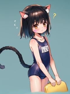 1girl, cat girl, solo, brown eyes, whisker markings, cat ears, animal ear fluff, animal ears, cat tail, tail raised, bangs, black hair, blush, closed mouth, collarbone, school swimsuit, one-piece swimsuit, name tag, holding, old school swimsuit,best quality,amazing quality,very aesthetic,absurdres,