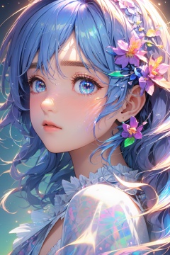 (((masterpiece))),((extremely detailed CG unity 8k wallpaper)),best quality,high resolution illustration,Amazing,highres,(best illumination, best shadow, an extremely delicate and beautiful),Colorful colors,mother of pearl iridescence,1girl,a cute anime girl with blue hair and flowers in her hair, in the style of artgerm, light gold and azure, 32k uhd, anime aesthetic, distinctive noses, childlike innocence and charm, aurorapunk,<lora:digital_colorful:0.8>