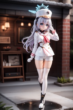 pvc style,(masterpiece:1.3), (absurdres:1.3), (best quality:1.3), (ultra-detailed:1.3), 1girl, looking at viewer, full body, smile, outdoors, cherino-fi, halo, shako cap, white jacket, white coat, uniform, white gloves, white shorts, black pantyhose, fur-trimmed shoes, fur-trimmed boots,(figma:0.6),full body, <lora:cherino-fi-000009:0.8>