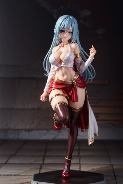 pvc style,(extremely detailed CG unity 4k wallpaper),(masterpiece),(best quality),(ultra-detailed),(best illustration),(best shadow),(absurdres),(detailed background), Olivia Servant, 1girl, solo, long hair, breasts, blue hair, smile, blue eyes, dress, looking at viewer, medium breasts, cleavage, armlet, upper body, very long hair,(figma:0.6),full body, <lora:OGT_Olivia_Servant-v2:0.8>