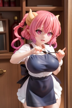 pvc style,(highres:1.2),(ultra-detailed:1.2),[high dynamic range lighting],(masterpiece:1.3), (best quality),highly quality, intricate details,(extremely detailed CG unity 8k wallpaper:1.2),best shadow,(extremely detailed fine touch:1.2), (high resolution), (8K), (extremely detailed), (4k), (pixiv), perfect face, nice eyes and face, (super detailed), detailed face and eyes, textured skin, absurdres, highres,reflection,looking at viewer,Ilulu,1girl,horns, low twintails, huge breasts,<lora:Ilulu-10:0.7>apron, blue shirt, cleavage, short sleeves,black apronpants,leaning forward,indoors,figma,full body,