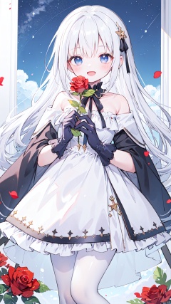 1girl, long hair, solo, gloves, dress, smile, bird, flower, holding, open mouth, white dress, very long hair, white hair, red flower, bangs, blush, looking at viewer, :d, pantyhose, bare shoulders, white pantyhose, rose, blue eyes, holding flower, star \(sky\), starry sky, sky, off-shoulder dress, red rose