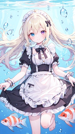 1girl, apron, dress, solo, blue eyes, long hair, bubble, underwater, white apron, frilled apron, fish, frills, blue dress, smile, short sleeves, blonde hair, wrist cuffs, bow, bangs, blush, heterochromia, air bubble, barefoot, maid headdress, closed mouth, clownfish, looking at viewer, maid apron, striped, hair between eyes, maid, striped bow, frilled dress, breasts, puffy short sleeves, purple eyes, floating hair, jewelry