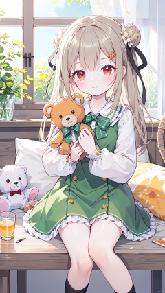 1girl,stuffed animal,stuffed toy,solo,dress,long hair,sitting,looking at viewer,teddy bear,holding stuffed toy,long sleeves,hair ornament,hair bun,bow,green dress,orange bow,plaid,blush,socks,frills,bangs,closed mouth,holding,red eyes,orange bowtie,flower,feet out of frame,ribbon,hair ribbon,single side bun,green bow,brown hair,table,blanket,black ribbon,hairclip,collar,bowtie,