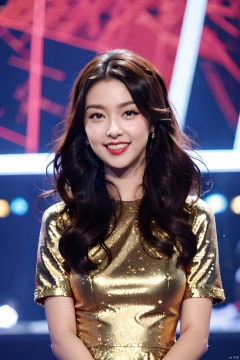 PHOTOREALISTIC REALISTIC,masterpiece,best quality,highres,ultra detailed,8k,1woman,dress,makeup,lipstick,smile,teeth,looking at viewer,cowboy shot,stage,stage light,